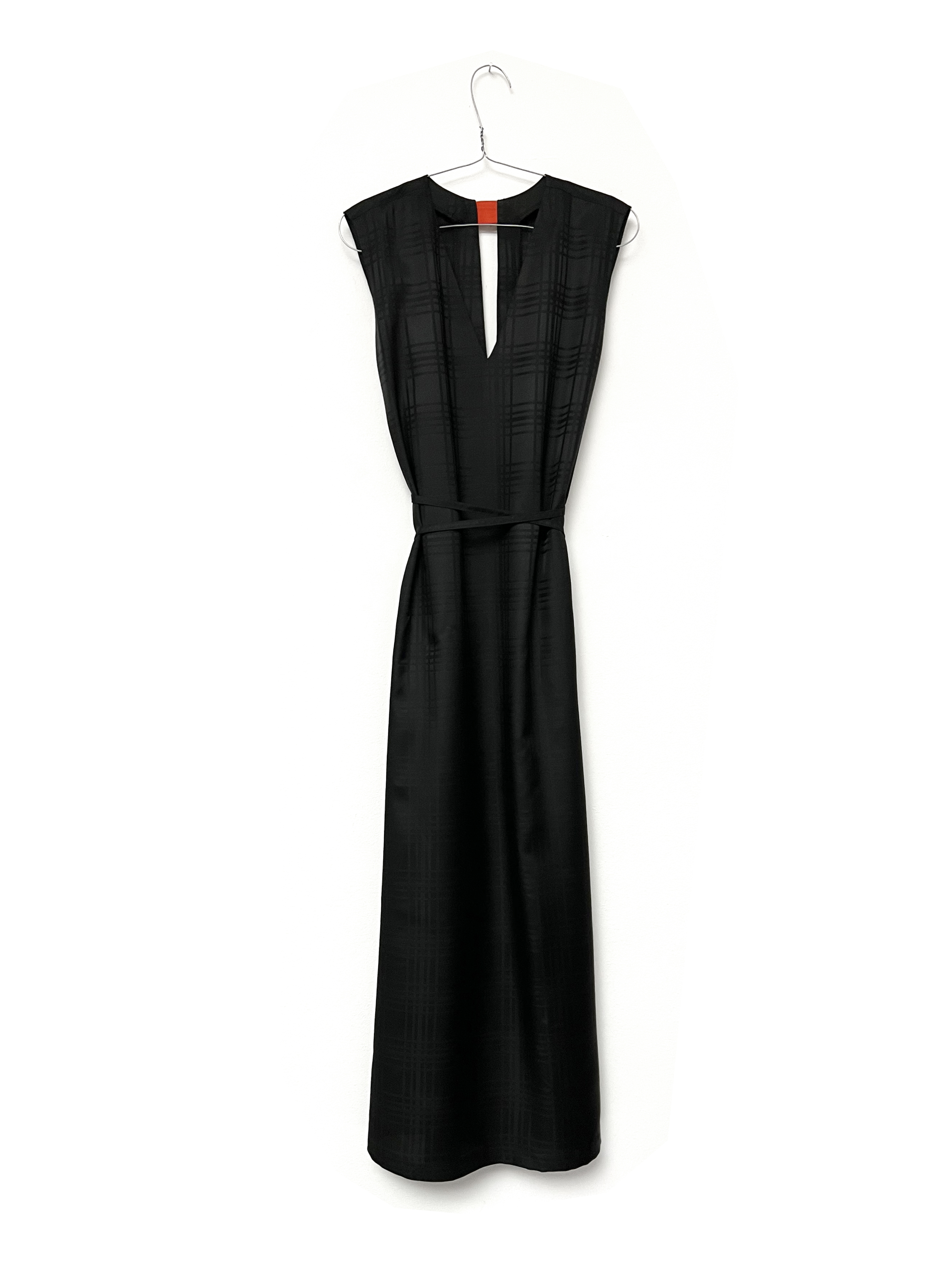 Sleeveless dress with ribbons and contrast neck opening on back. V-neck on front, slit on back. Hidden side pockets. Tone-in-tone black check pattern.