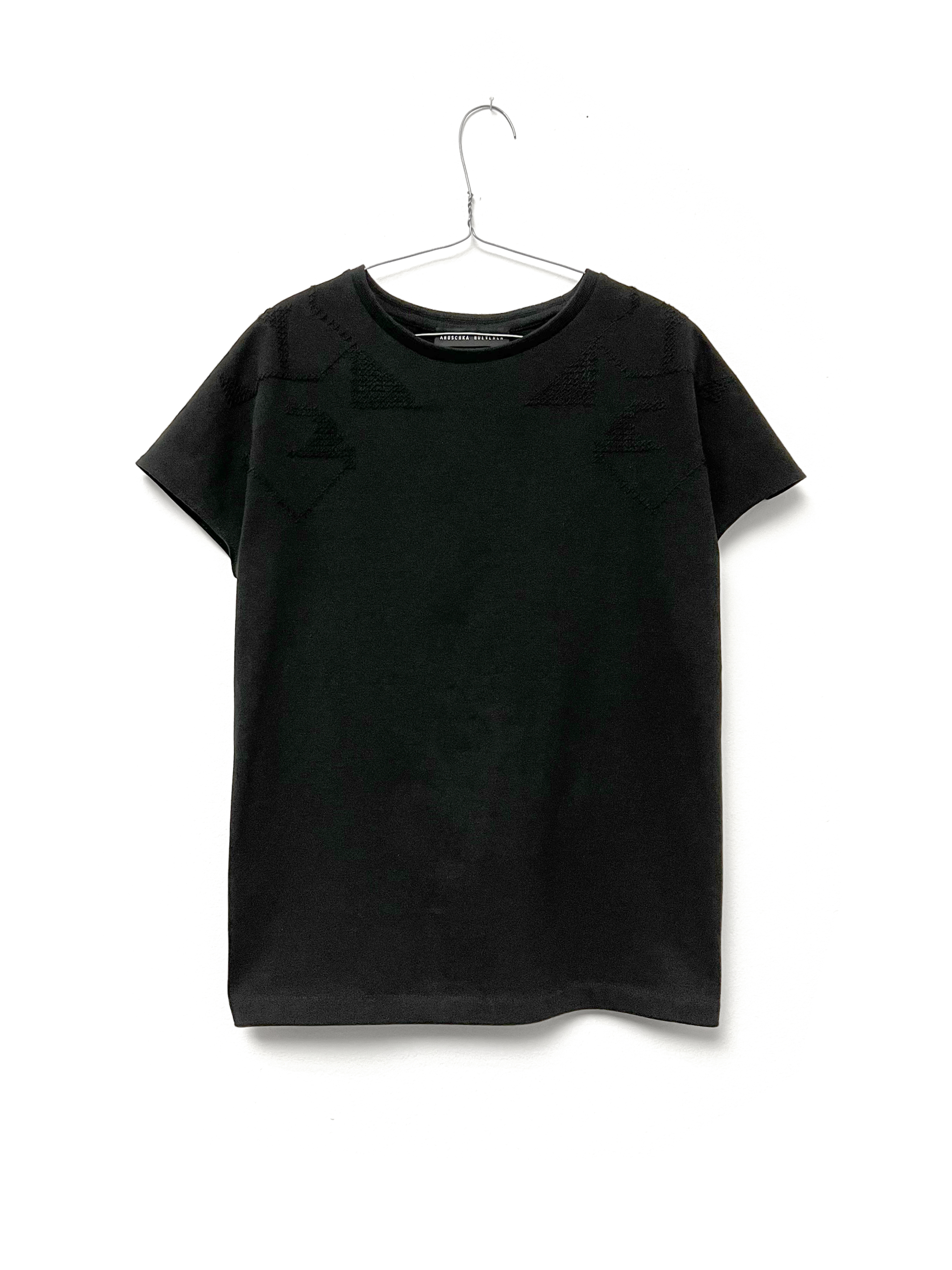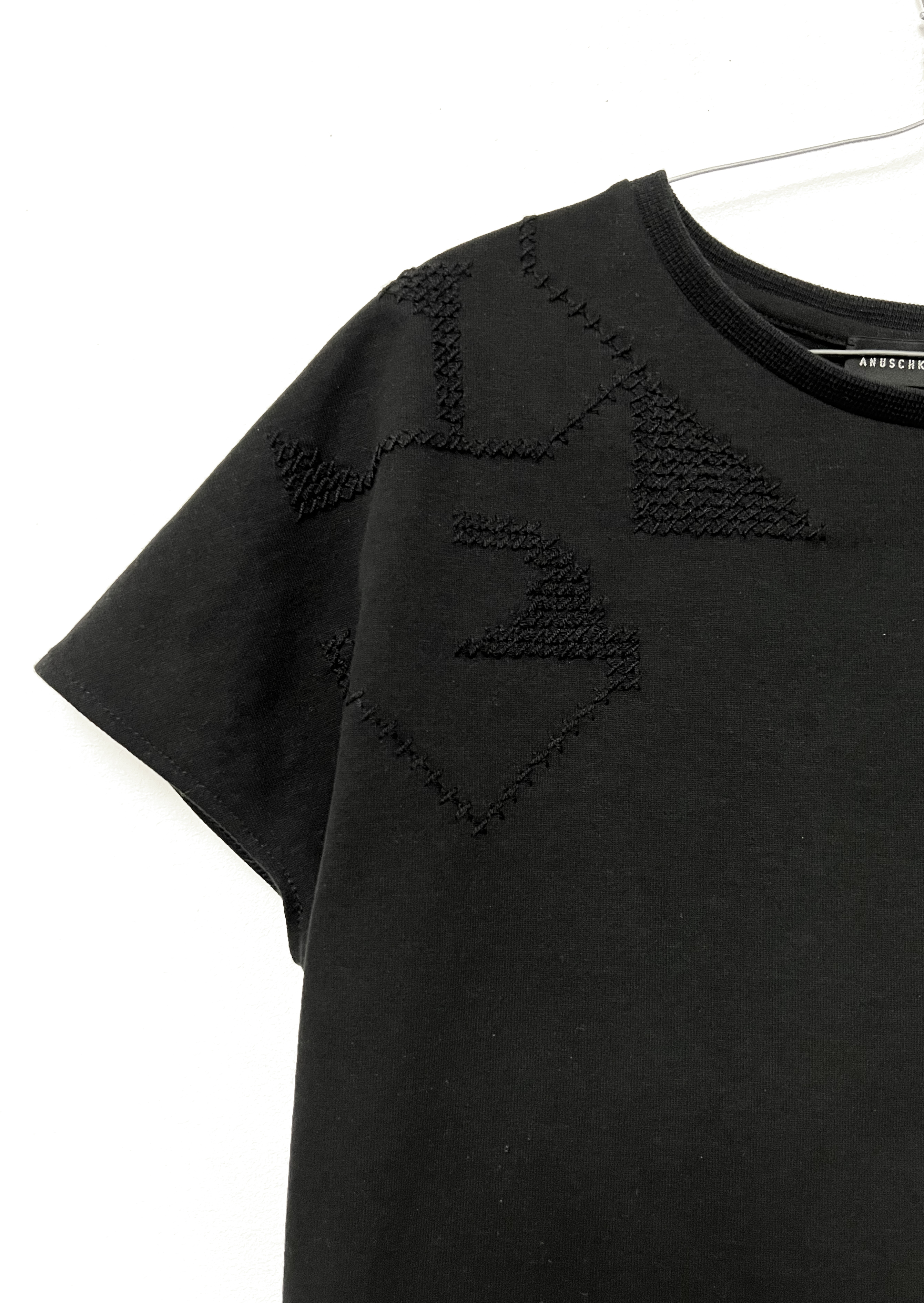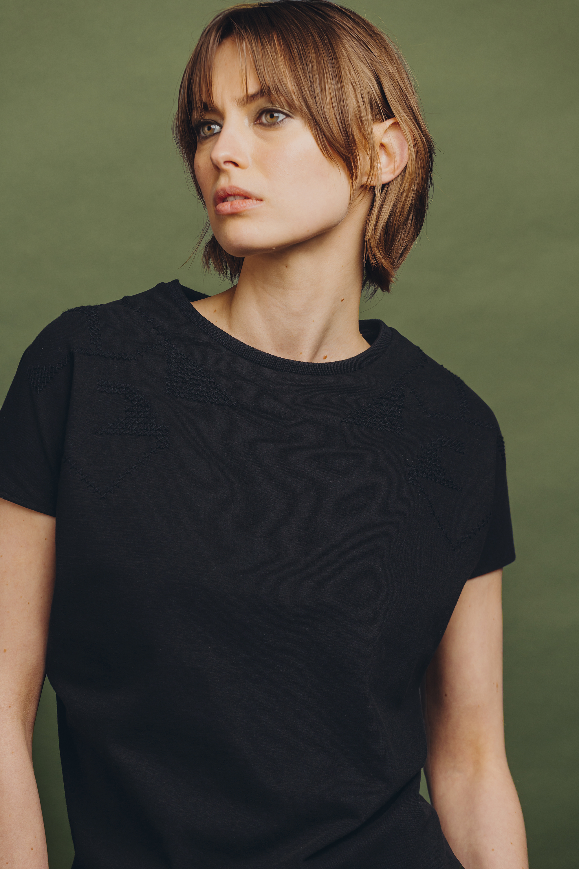Hand-embroidered black jersey T-shirt. Black tone-in-tone cross stich embroidery.