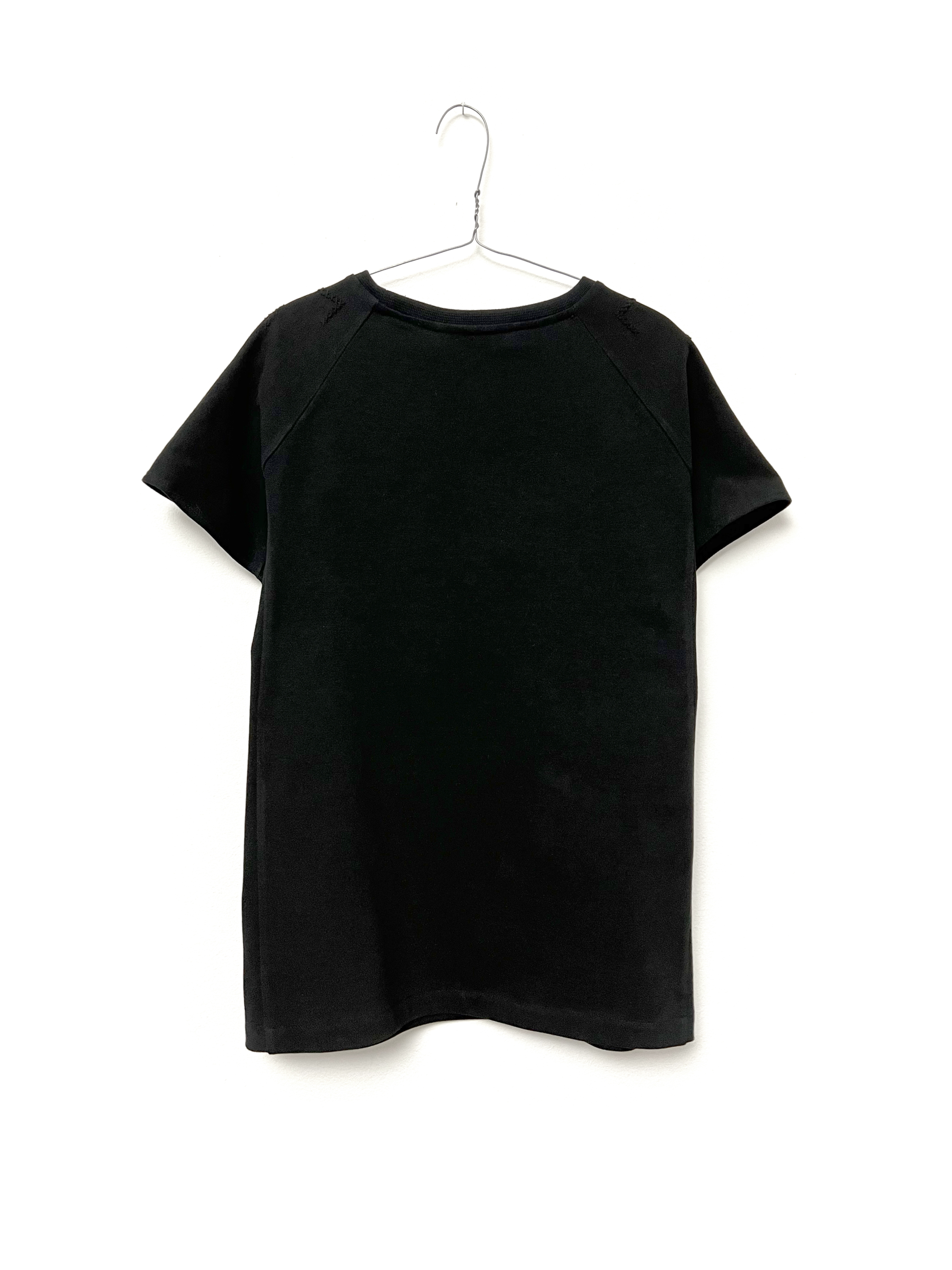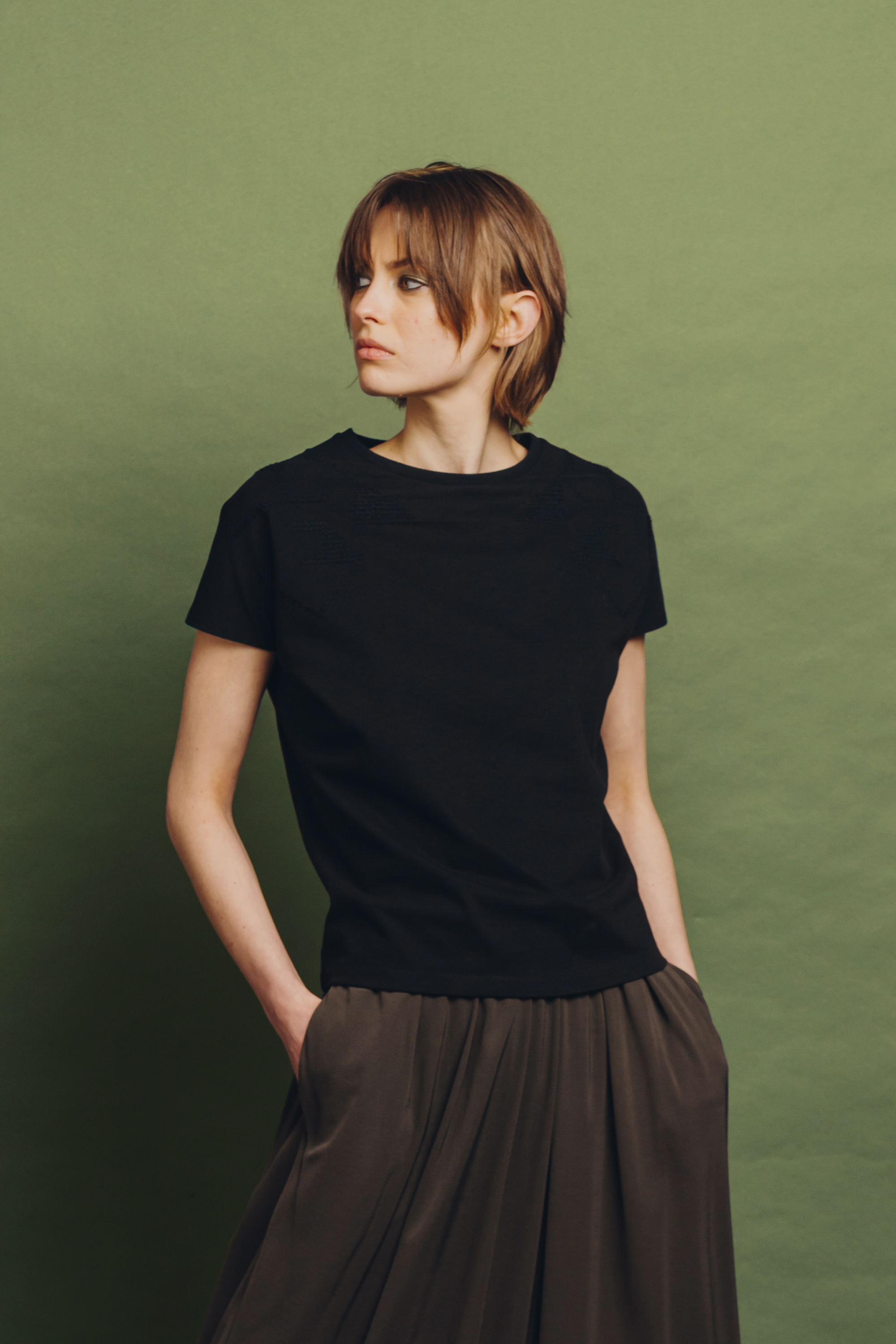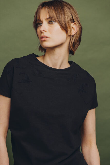 Hand-embroidered black jersey T-shirt. Black tone-in-tone cross stich embroidery.