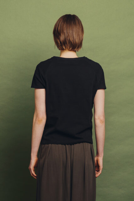 The T-shirt is made from a heavy weight elastic jersey fabric. The model is 1.78m, wearing a szie 36.