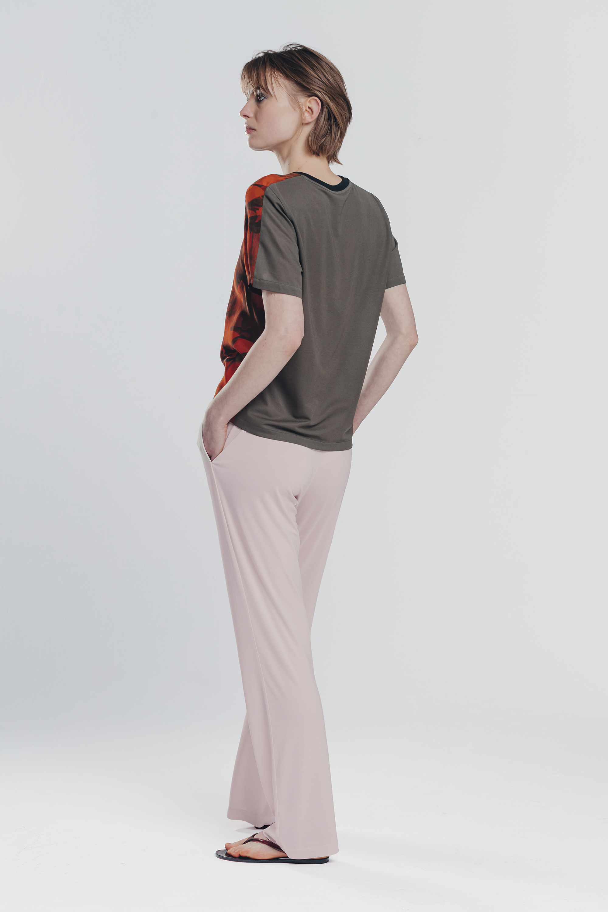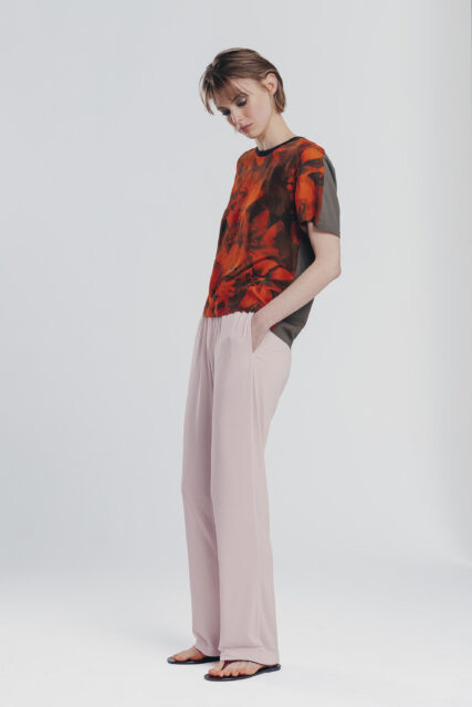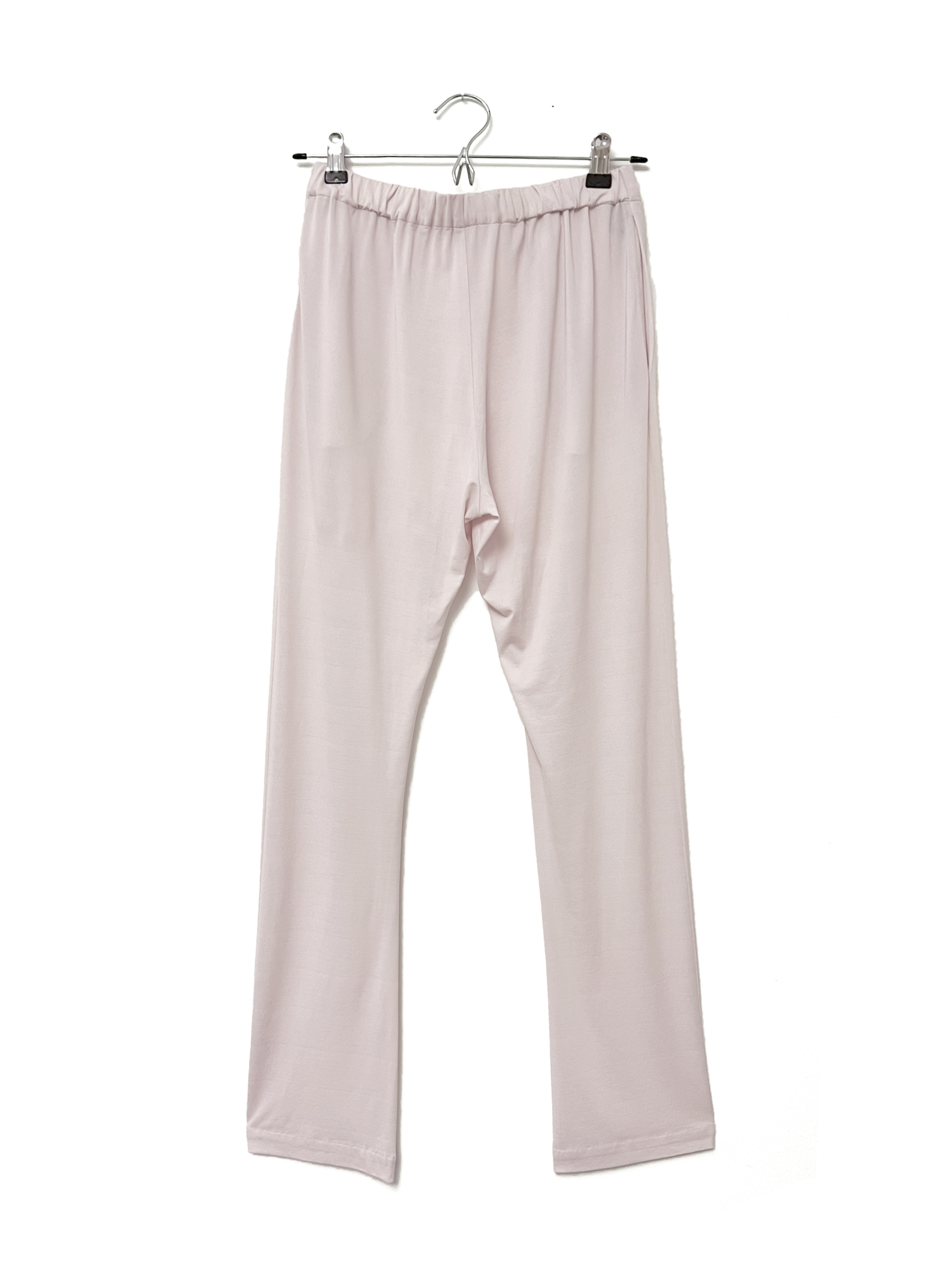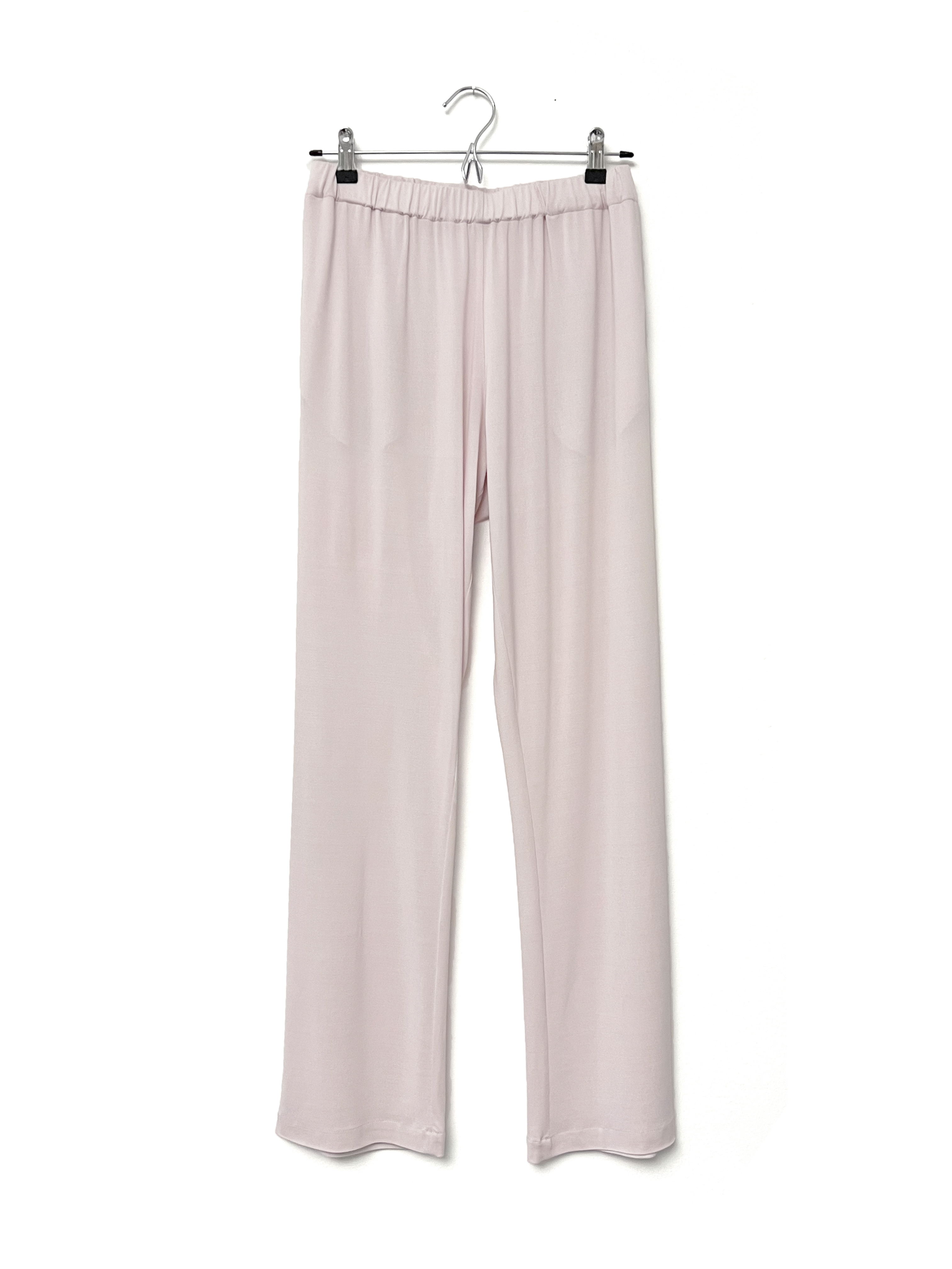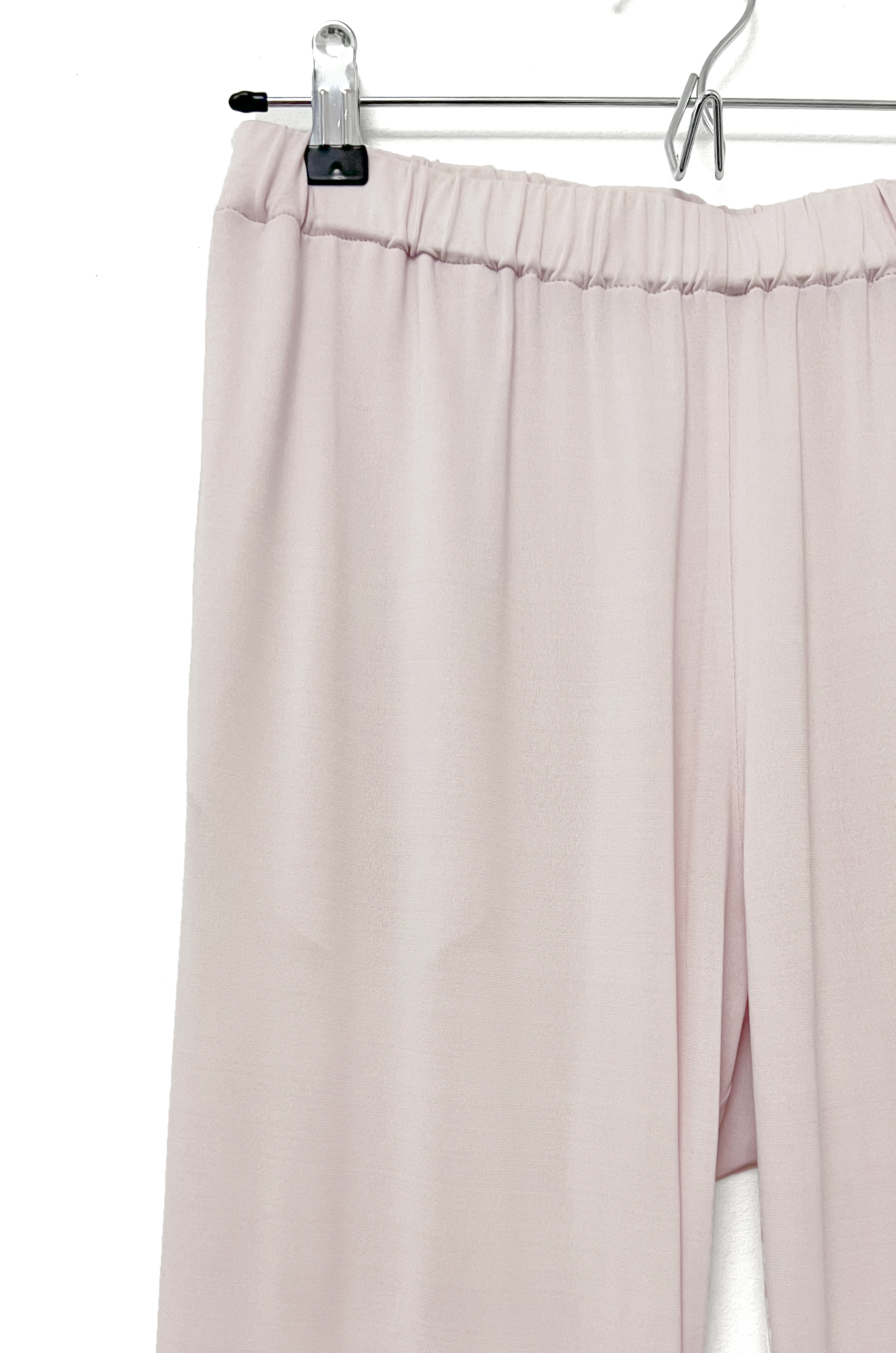 Casual blush pink jersey pants, two hidden side pockets and elastic waistband. Wider leg.