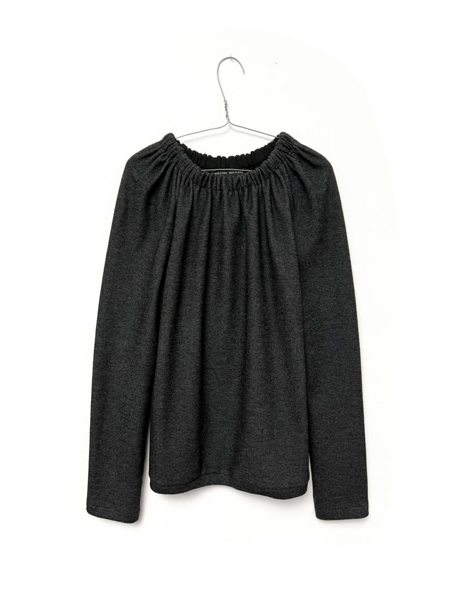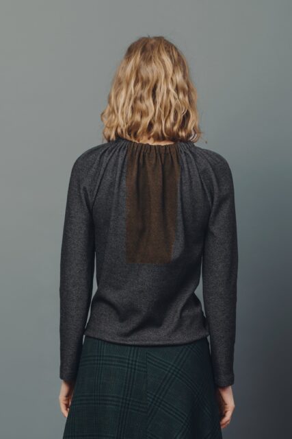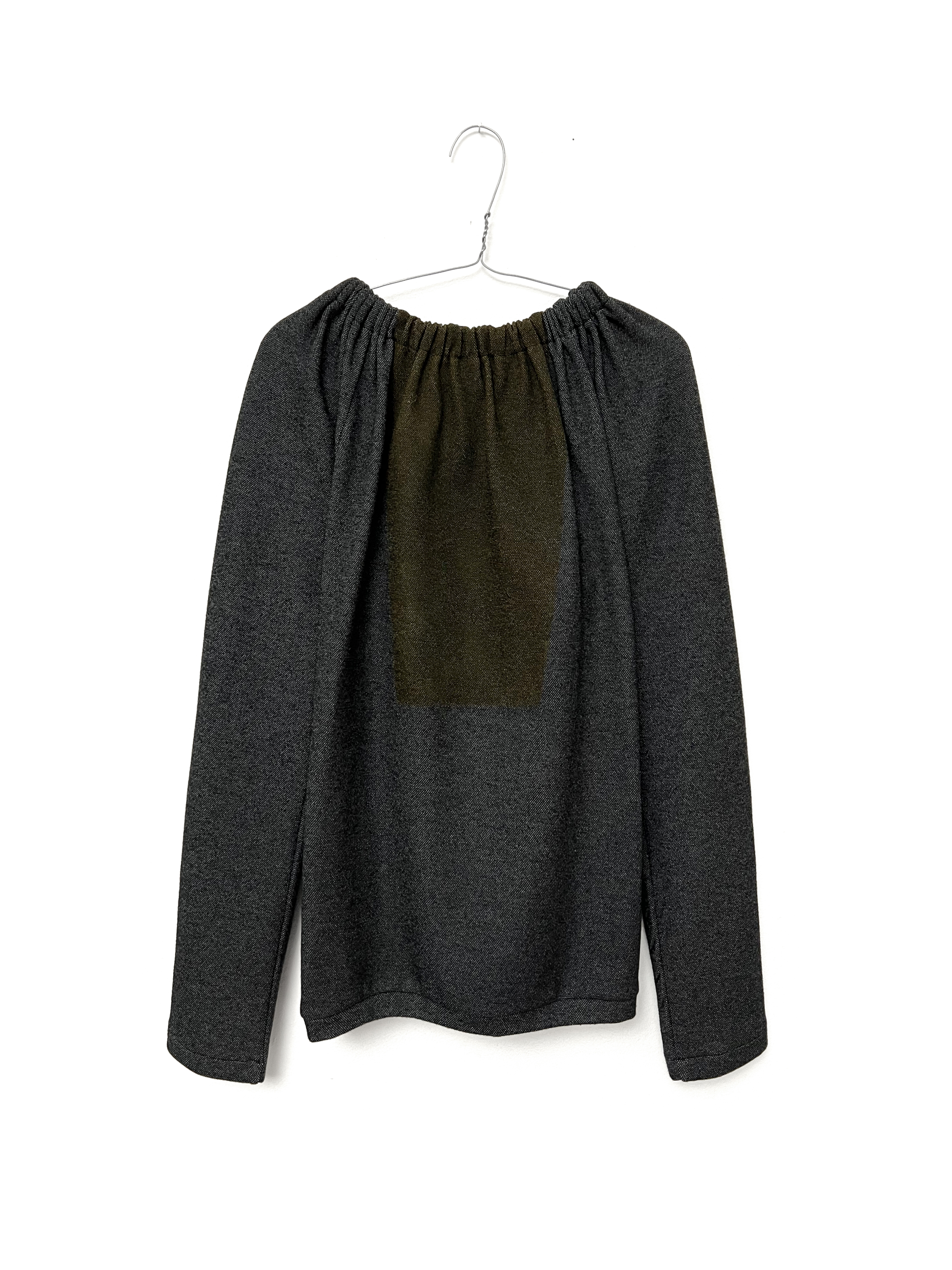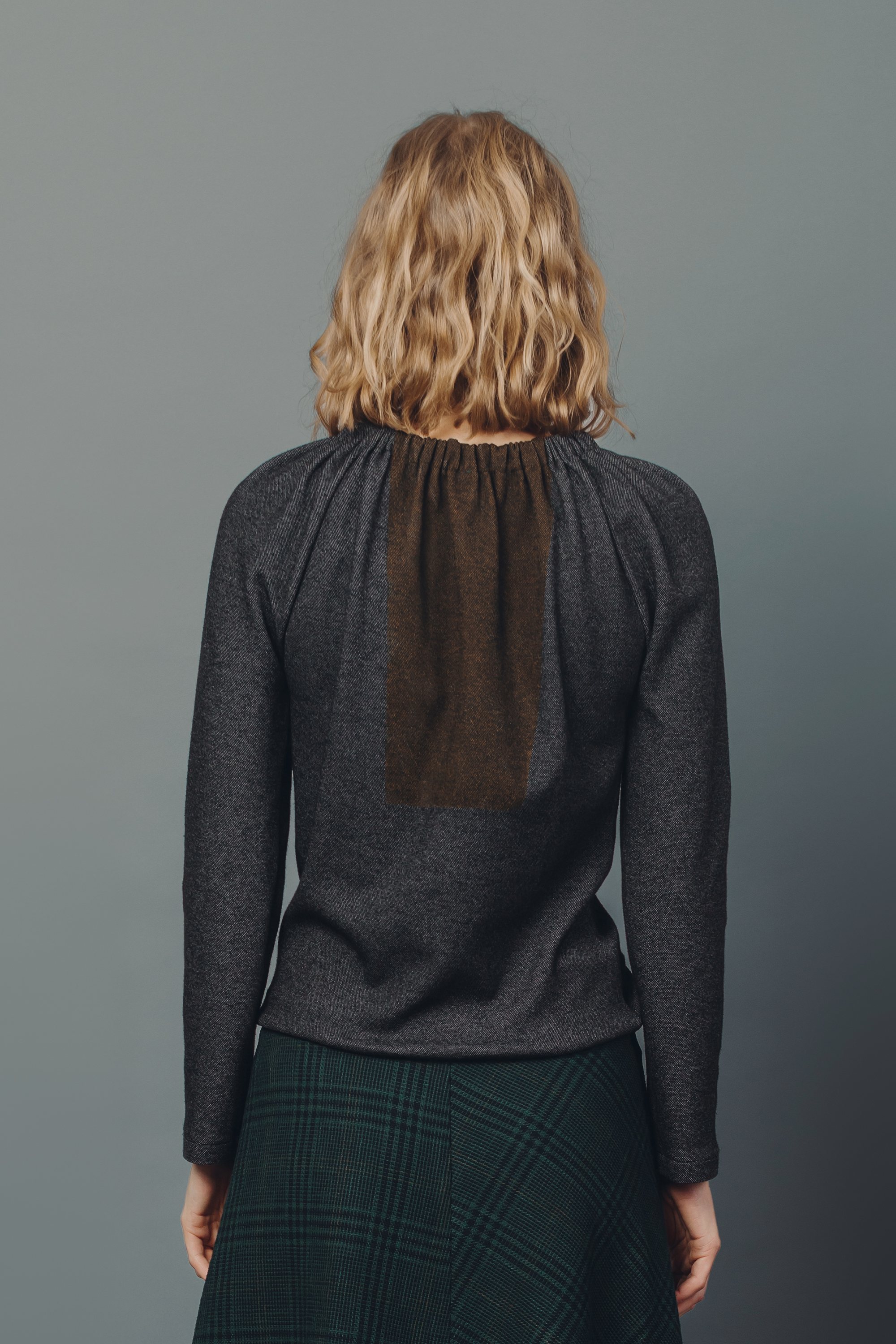 Casual gathered jersey top with contrasting print on back. Long sleeves.