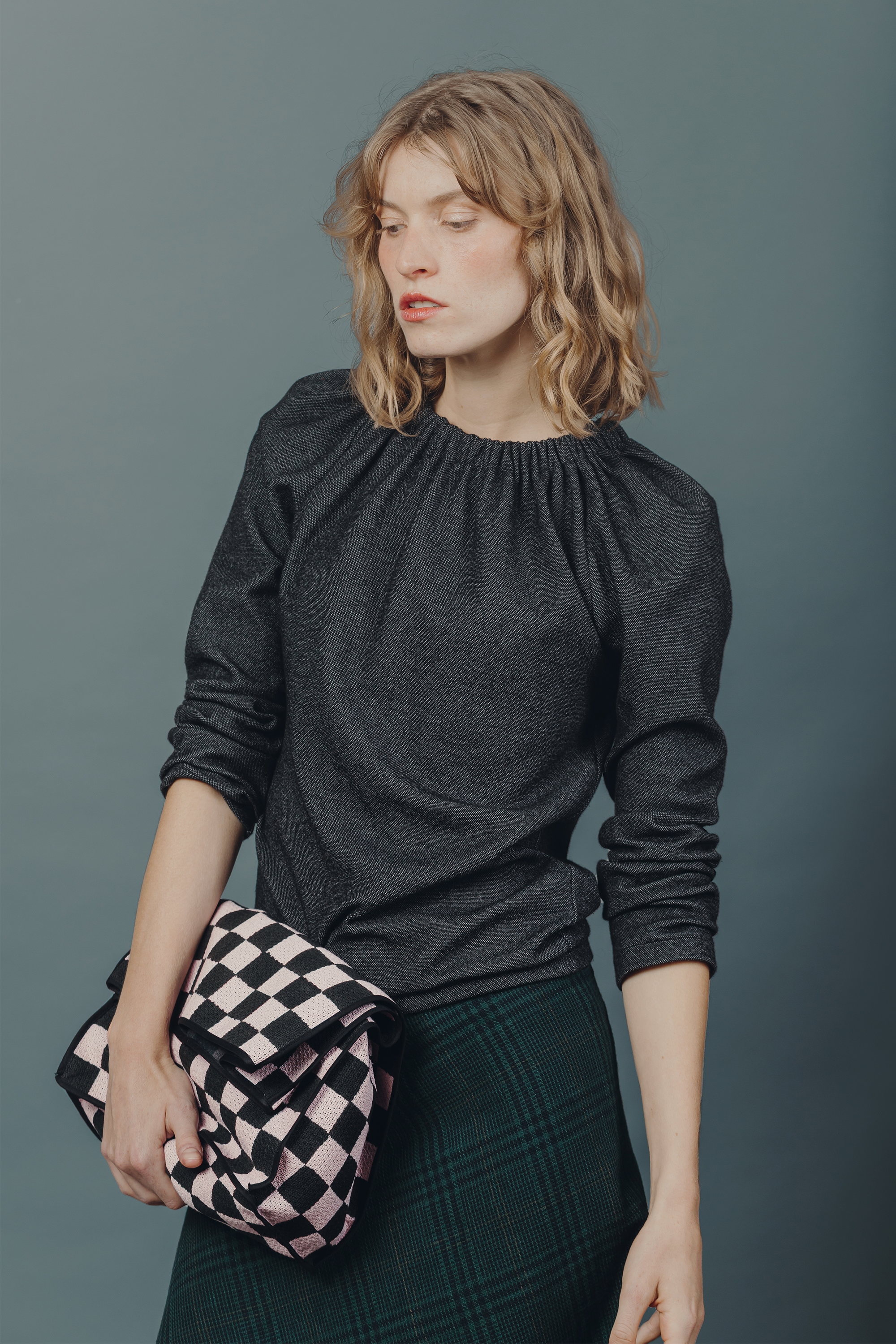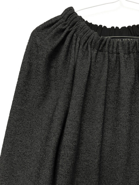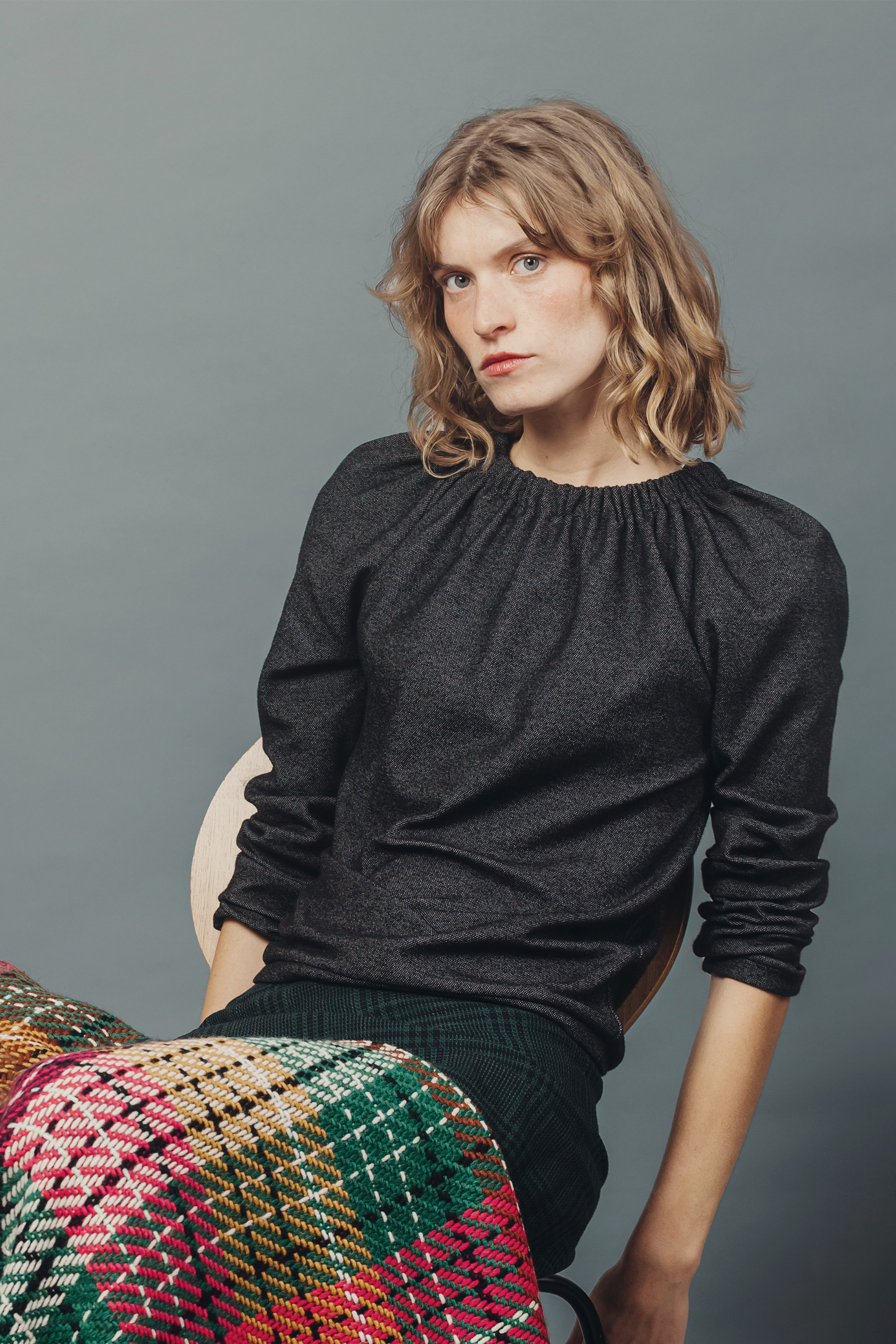Casual gathered jersey top with contrasting print on back. Long sleeves.