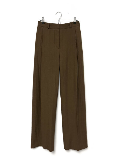 Golden brown pants with generous pleat on front leg. Two side pockets, one piped pocket on back. Zip closure on front, belt loops. Wide leg.