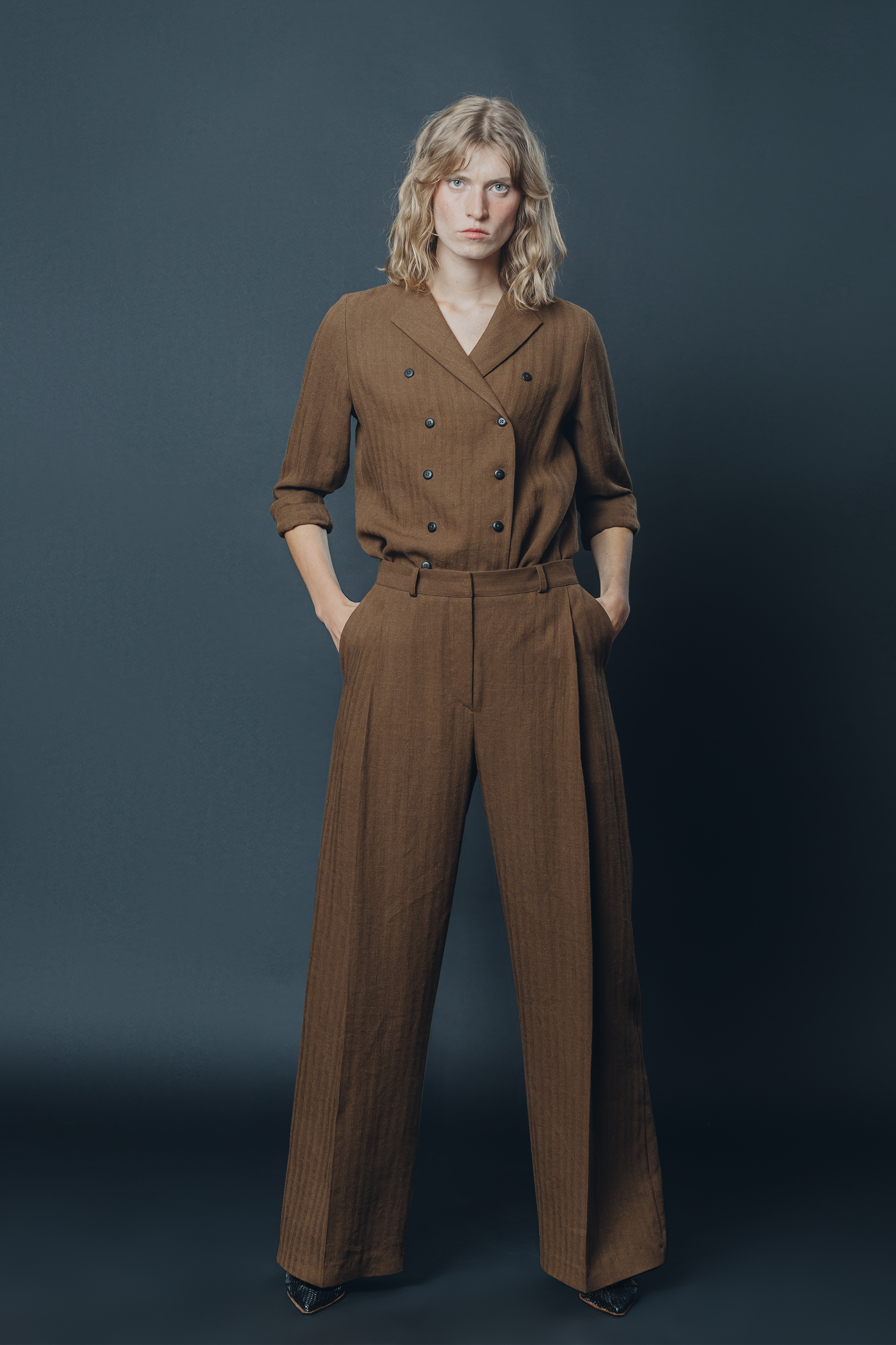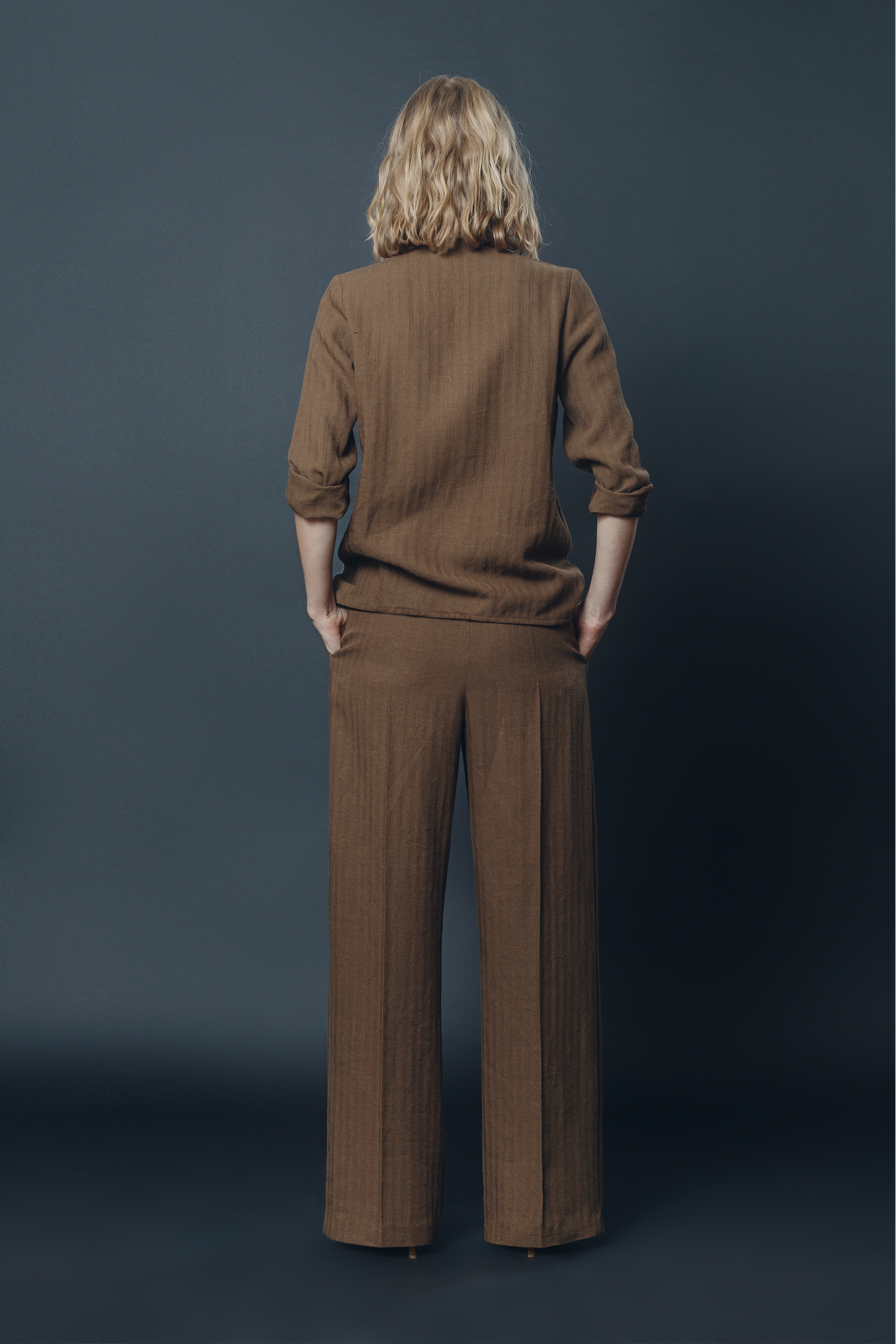 The pants are made from a medium weight viscose/linen blend fabric. The model is 1.78m, wearing a long size 36. The usual size 36 is slightly shorter (109cm).