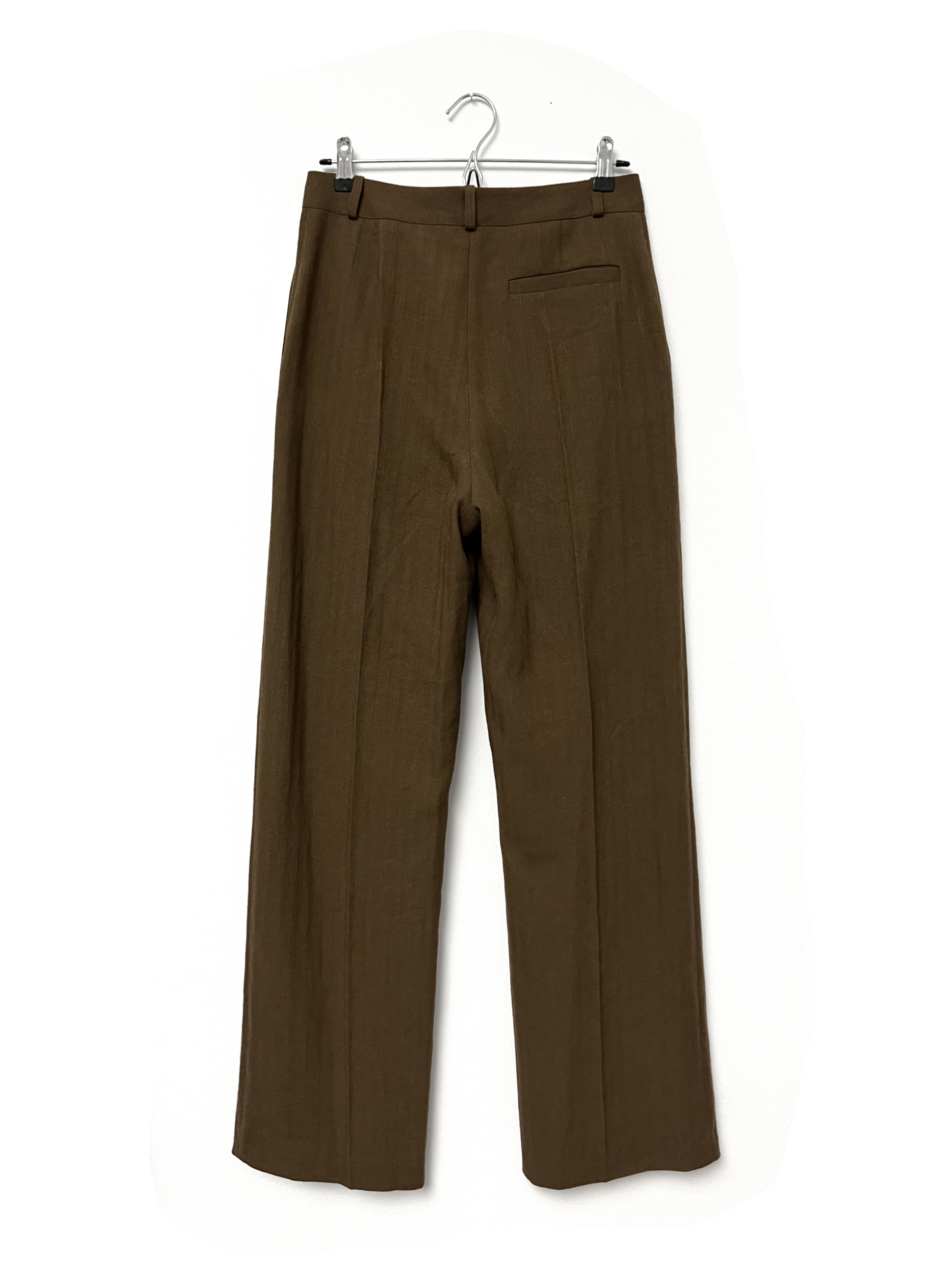 Golden brown pants with generous pleat on front leg. Two side pockets, one piped pocket on back. Zip closure on front, belt loops. Wide leg.
